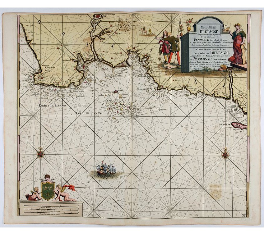 cartes les plus anciennes de ma collection) me fait rêver aux voyages lointains et incertains des marchands du 18 ème , quand la Bretagne n’avait pas encore ses contours d’aujourd’hui, quand d’effrayants animaux marins étaient représentés tout autour de ses