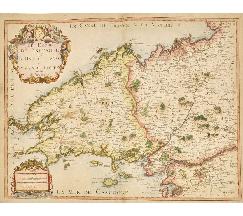 Cette collection retrace 300 ans d’histoire de la Bretagne, elle est sans aucun doute la plus importante jamais réunie mais aussi la plus variée car elle comprend aussi bien des cartes générales de la Bretagne que des cartes régionales et départementales mais aussi des cartes marines, des plans de villes et de magnifiques cartes manuscrites du plus grand intérêt.